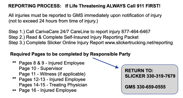 If you have been injured at work, you must complete a BWC injury packet, these packets can be found in the truck, with management or you can download this packet here. (Employees who are injured on the job and who are seeking medical attention for a work-related injury must immediately complete to an alcohol and drug screen.)